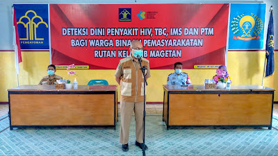 MAGETAN – Satu lagi upaya dilakukan oleh Rutan Magetan guna meningkatkan derajat kesehatan Warga Binaan Pemasyarakatan. Bekerja sama dengan Dinas Kesehatan Kab. Magetan, pagi ini (29/06/2021) Rutan Magetan menggelar kegiatan skrining atau deteksi dini penyakit HIV (human immunodeficiency virus), TBC (Tuberkulosis), IMS (Infeksi Menular Seksual) dan penyakit tidak menular (Hipertensi, Diabetes, Asam Urat dan Kolesterol) bagi seluruh WBP.