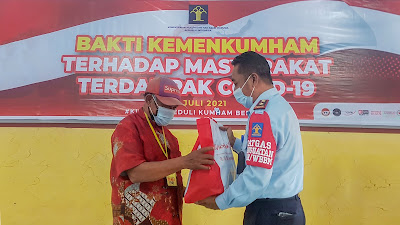 Sebagai wujud kepedulian sosial kepada masyarakat dan ASN yang terdampak pandemi Corona Virus Disease (Covid-19), hari ini (29/07/2021) seluruh jajaran Kementerian Hukum dan Hak Asasi Manusia melaksanakan kegiatan Bakti Sosial bertajuk Kumham Peduli Kumham Berbagi “BaktI Kemenkumham bagi Masyarakat Terdampak Covid-19”.