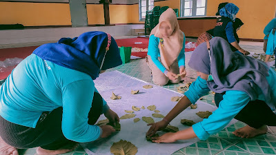 Pelatihan membatik yang dilakukan kali ini menggunakan bahan kain polos dan daun. Adapun daun yang digunakan hanya daun yang dapat menimbulkan warna ketika dikukus pada kain, seperti daun jati, daun jarak ataupun daun lana.