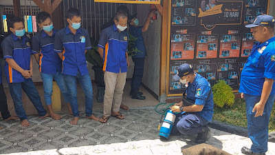 Kemungkinan berikutnya, apabila api bersumber langsung dari saluran tabung (tanpa regulator dan selang), maka penanganan yang dilakukan adalah segera menutup tabung dengan kain atau karung goni yang sudah dibasahi sebelumnya. Tamping juga diajarkan bagaimana praktek penggunaan APAR (Alat Pemadam Api Ringan) pada saat situasi darurat. (Humas Rutan Magetan)
